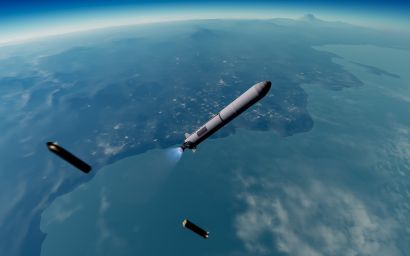 Ascension habituelle vers l’est, pitch ~10–15° à 100 m/s.