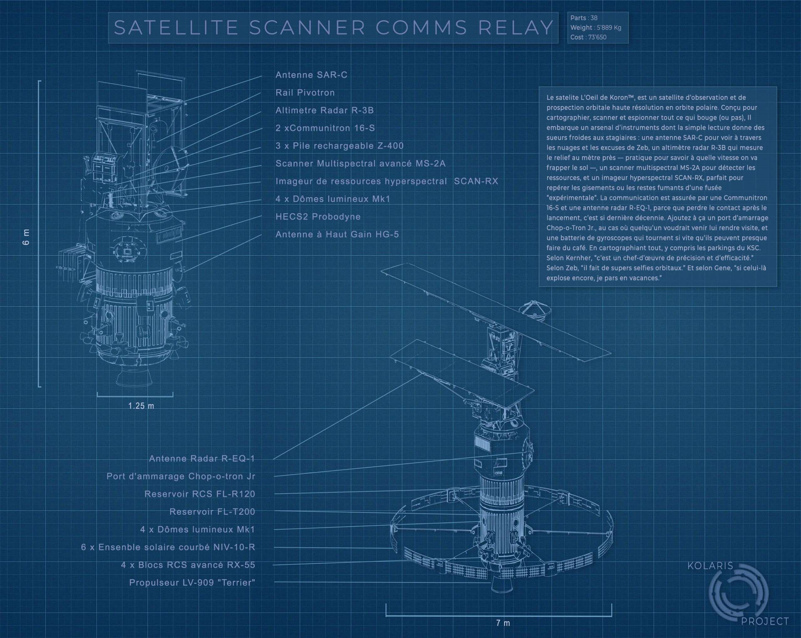 Le satellite embarque une panoplie d’instruments capables de mesurer à peu près tout ce qui existe sur Kerbin : un radar altimétrique R-3B pour modéliser le relief, un scanner multispectral MS-2A pour analyser la nature des sols, un imageur hyperspectral SCAN-RX pour détecter les ressources exploitables, et une antenne de communication haut débit pour transmettre ces précieuses données (et, selon Jeb, quelques vidéos de ses vols “d’essai”).