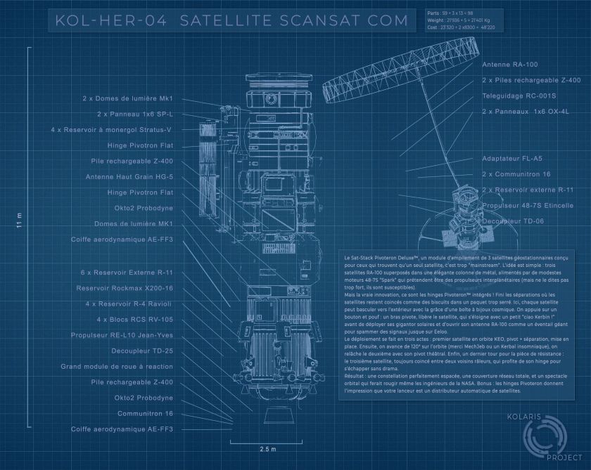La mission KOL-HER-04 a été officiellement approuvée par le comité de planification intersidérale de Kerbin (comité composé de trois ingénieurs somnolents, d’un stagiaire et d’une machine à café en panne). Objectif : placer deux satellites de 7 tonnes chacun en orbite polaire de 700 km avec toute une cargaison d’antennes, de caméras et de trucs qui clignotent pour faire sérieux. Le plan initial, rédigé sur un post-it collé au dos d’un booster, était simple : « lancer, séparer, et prier que ça marche ». Mais très vite, les ingénieurs ont réalisé que si on libérait les deux engins en même temps, ils se colleraient l’un derrière l’autre comme des canards en file indienne — ce qui est très mignon, mais absolument inutile pour couvrir toute la planète. D’où l’idée de faire du phasing orbital : une technique complexe, mais qui, expliquée à un Kerbal, revient à dire « on fait tourner un satellite plus vite ou plus lentement jusqu’à ce qu’il se retrouve pile en face de l’autre ». Facile, non ?