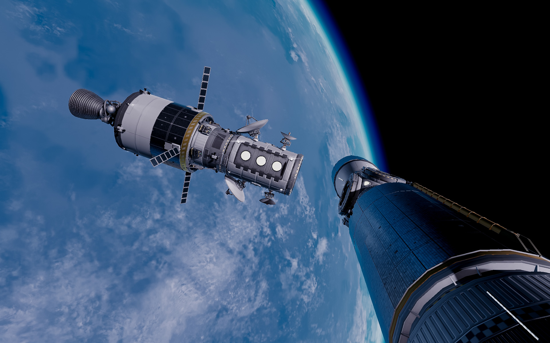 À environ 2 km de la station, le contrôle passe en mode manuel. Le module oriente ses antennes, déploie ses RCS, et s’aligne sur le port d’amarrage désigné. La tension monte au KSC, mais Bill Kerman, responsable de la manœuvre, reste calme : “C’est comme garer un rover… sauf à 2 000 m/s.” L’approche finale se fait à 0.2 m/s, dans un ballet de corrections minuscules.