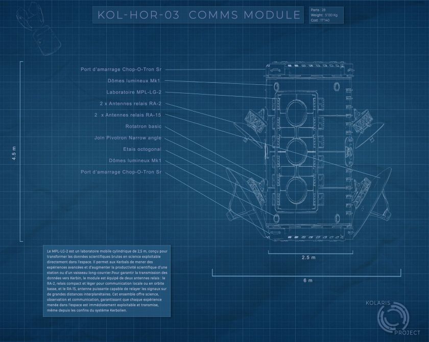 Mais ce n’est pas tout ! Le module embarque aussi une paire d’antennes RA-15 et RA-2, montées sur pivotrons et rotatrons, afin d’assurer une couverture de communication quasi totale. Ces antennes pourront se tourner automatiquement vers Kerbin, la Mun, Minmus ou toute autre cible plus ou moins volontairement choisie par Bob. Grâce à cette configuration mobile, la station deviendra un nœud de relais interplanétaire, capable de maintenir le contact avec les futures missions Kolaris en route vers les lunes ou les confins du système.