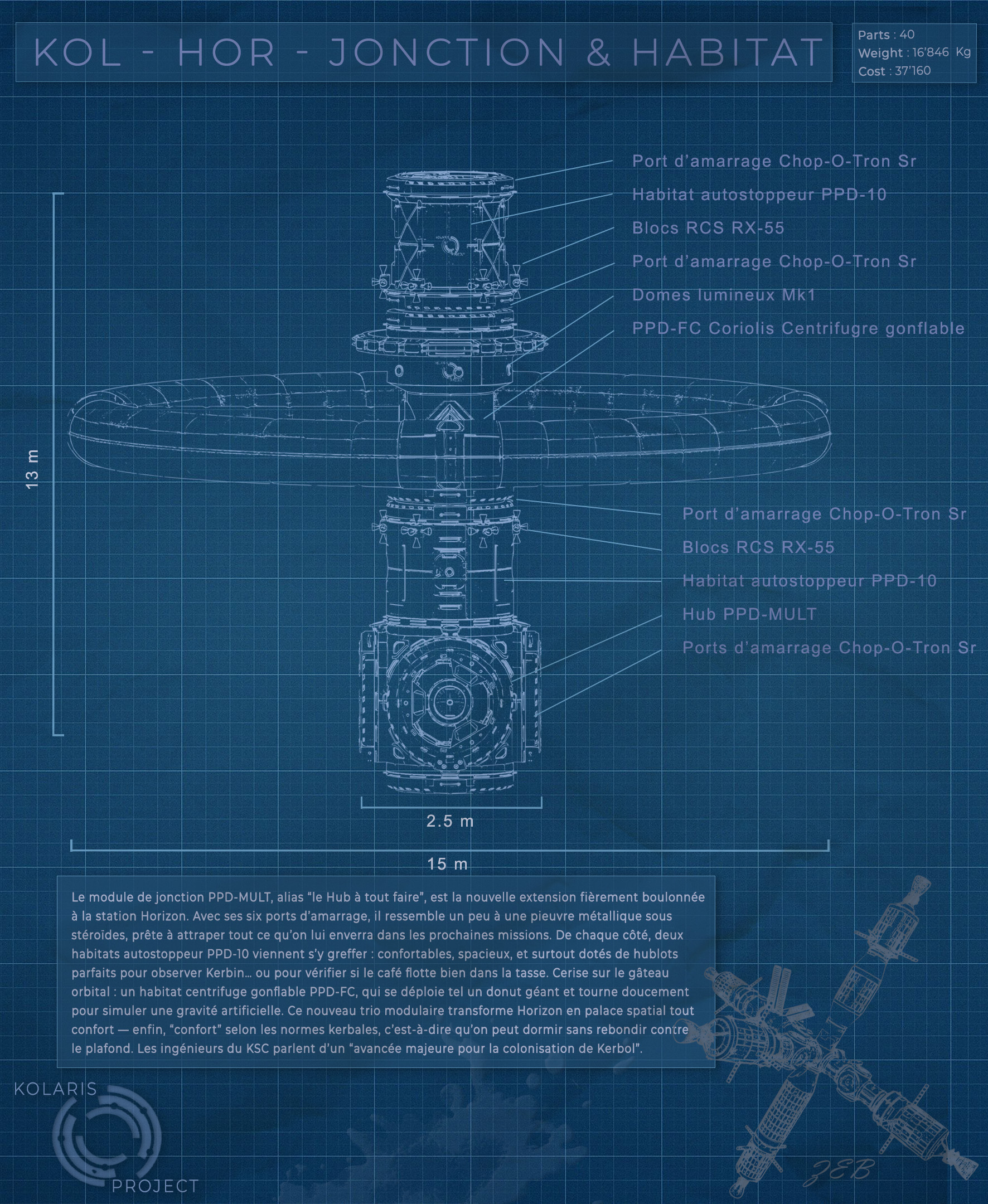 La mission KOL-HOR-07 s’inscrit dans le cadre du vaste programme Horizon, pierre angulaire du projet Kolaris, dont l’objectif ultime est de préparer la colonisation de Kerbol en développant une infrastructure orbitale stable autour de Kerbin. Cette mission consiste à livrer et activer deux Rescue Pods pressurisés, destinés à servir de modules d’évacuation et de transport de courte portée pour la station Horizon, tout en acheminant deux ingénieurx chargés de mettre en service le module centrifuge PPD-FC “Coriolis” récemment arrimé.