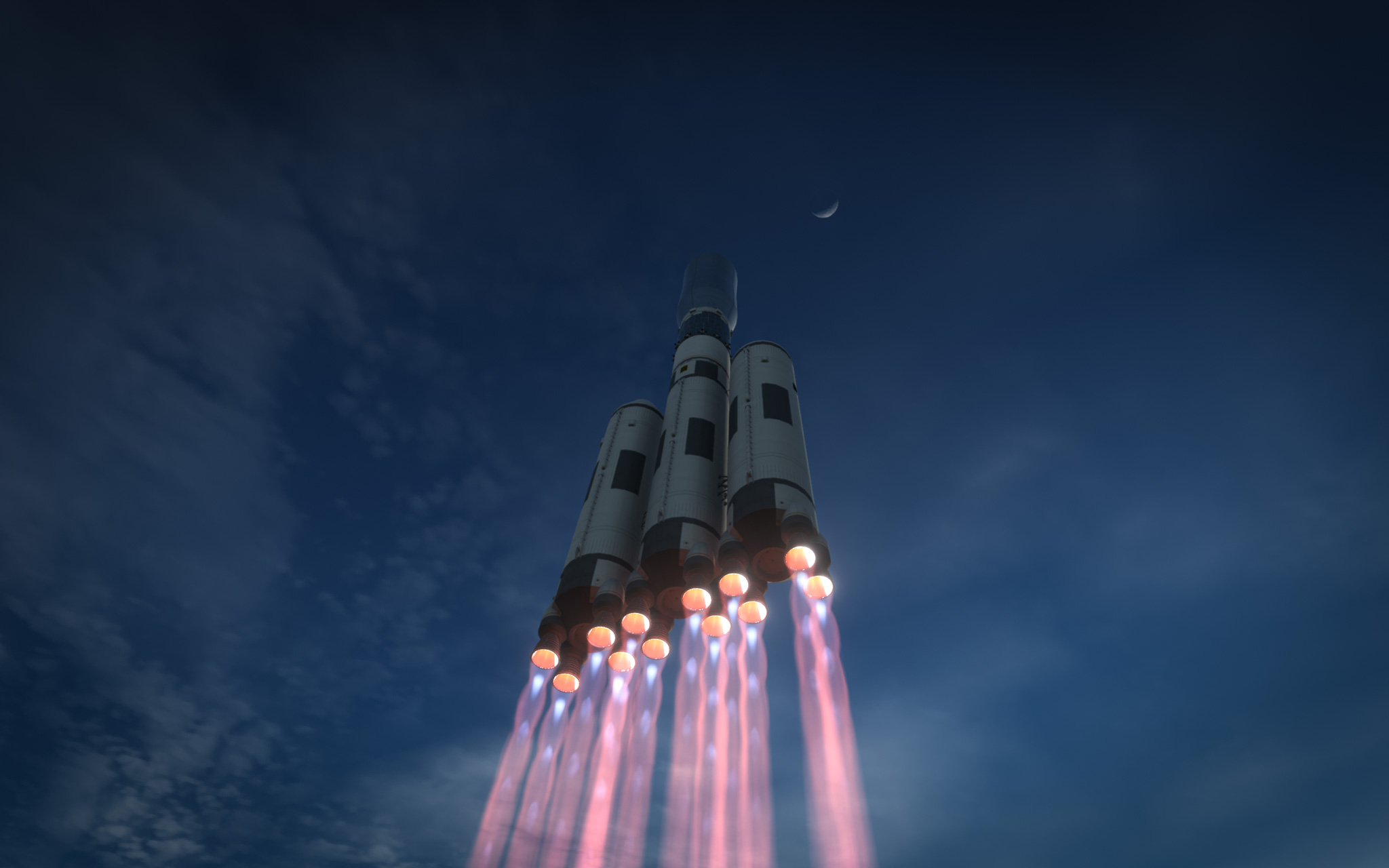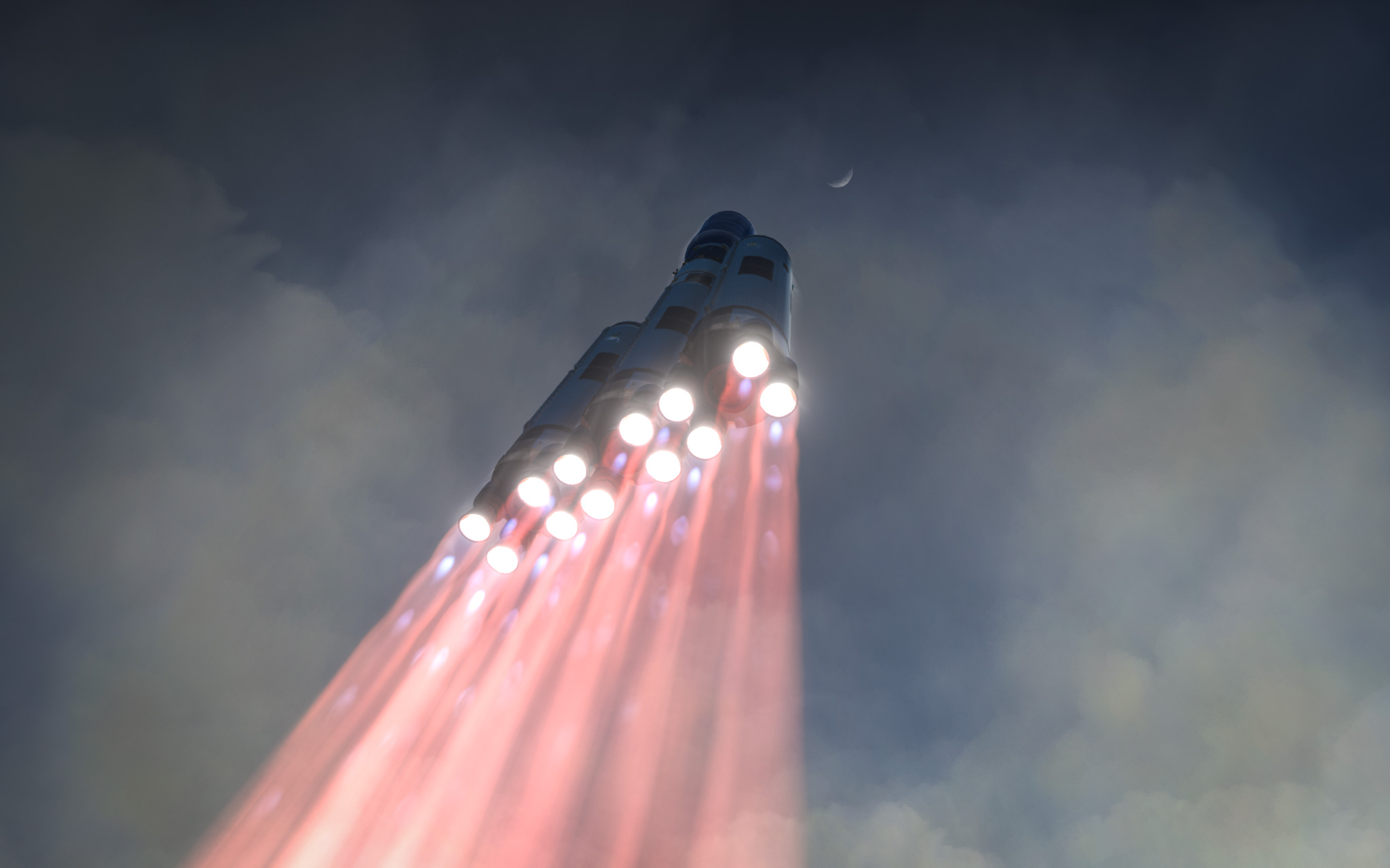 T-0:00:00 – Allumage des six propulseurs principaux. Décollage majestueux, cris de joie, puis de panique, puis à nouveau de joie.